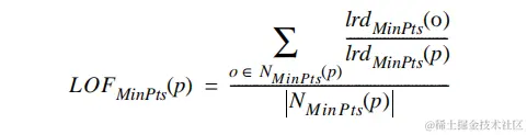 得到lrd(局部可达密度)以后就可以将每个点的lrd将与它们的k个邻点的lrd进行比较,得到局部异常因子LOF。更具体地说,LOF在数学上是对象的邻居点()的lrd平均值与的lrd的比值。