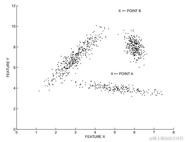 基于距离的检测适用于各个集群的密度较为均匀的情况。在下图中,离群点B容易被检出,而若要检测出较为接近集群的离群点A,则可能会将一些集群边缘的点当作离群点丢弃。而LOF等基于密度的算法则可以较好地适应密度不同的集群情况。