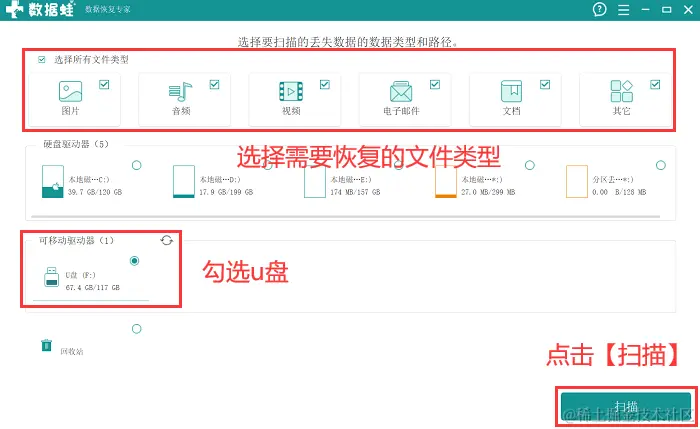 2.建议勾选所有文件类型,然后将u盘盘符勾选上,点击 【扫描】;