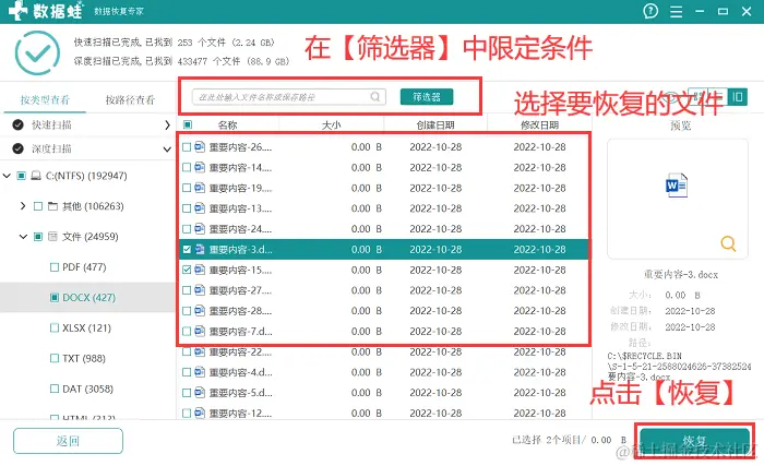 4.深度扫描完成之后,直接借助【筛选器】对所需恢复的文件进行条件限定,这样能提高选择速度。完成选择后,点击【恢复】 ,然后需要将文件保存在电脑的任意磁盘。