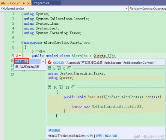 该类继承Quartz.IJob,实现接口,如下图: