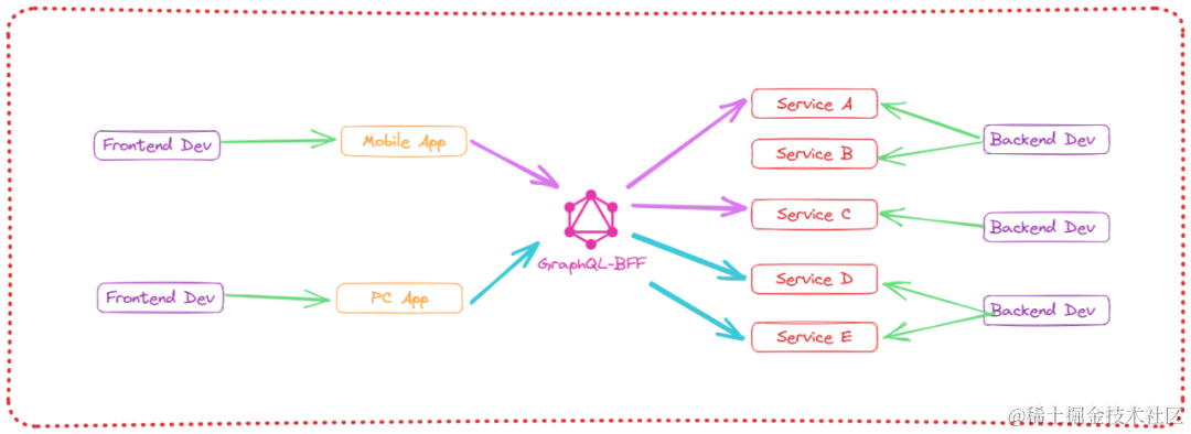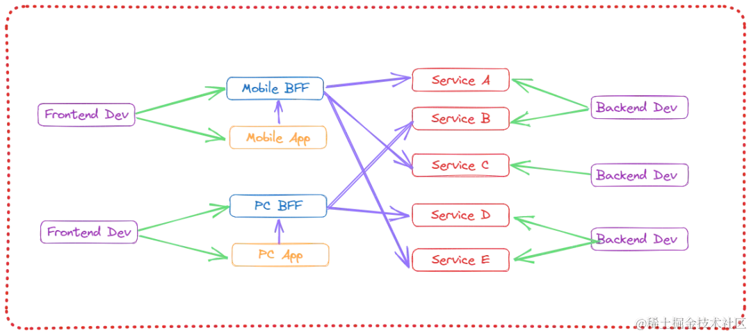 如上图所示,紫框为研发团队(前端或后端),蓝框为 BFF 服务,黄框为前端应用,绿色箭头表示 “开发”,紫色箭头表示 “调用”。