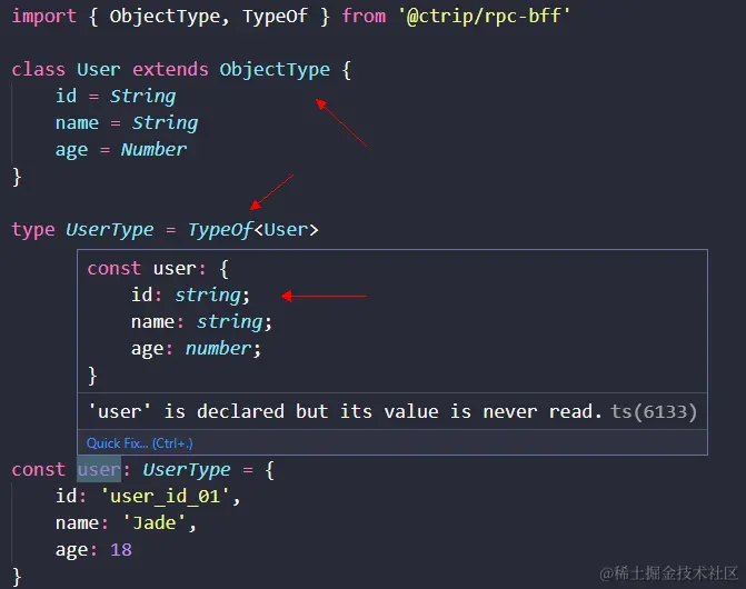 前端同步 RPC-BFF 的接口契约后,在代码编辑器里立即可以看到类型系统的 type-check 结果。