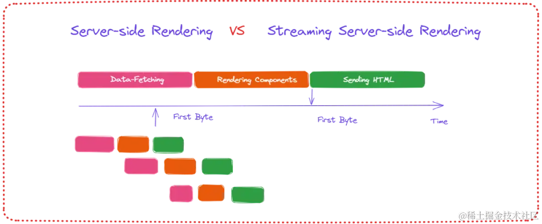 如上图所示,紫色箭头表示 “时间”,粉色框为数据获取,橙色框为组件渲染,绿色框为发送 HTML 到浏览器。我们可以看到,朴素的 SSR 是一个串行过程,组件渲染阶段需要等待数据获取全部结束。而充分的 Streaming SSR 则有多次数据获取的并发任务(调用了多次后端接口),组件渲染并不需要等待所有数据获取任务结束,只需相关数据就位即可进入组件渲染及后续发送 HTML 的流程。用户可以更早看到内容。