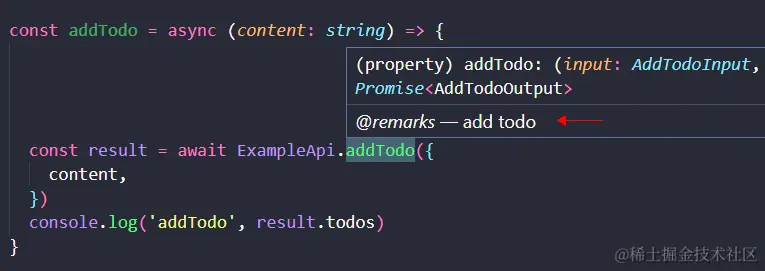 如上所示,我们在定义 addTodo 接口的 input schema 和 output schema 时,不仅仅提供了对应的类型,还添加了相关的 description 描述。经过前端的代码生成后,将得到如下代码: