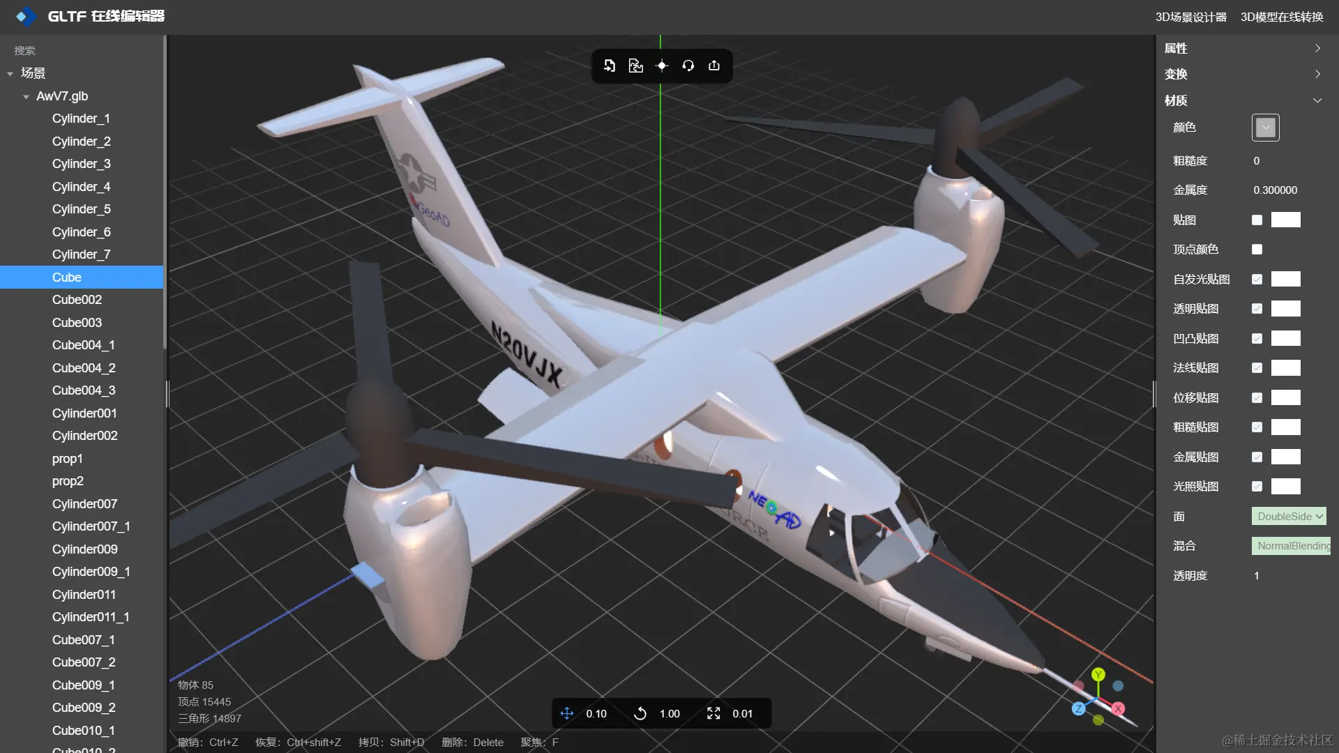 打开GLTF 编辑器 ,在编辑器导入一个GLB格式的飞机模型,如图所示: