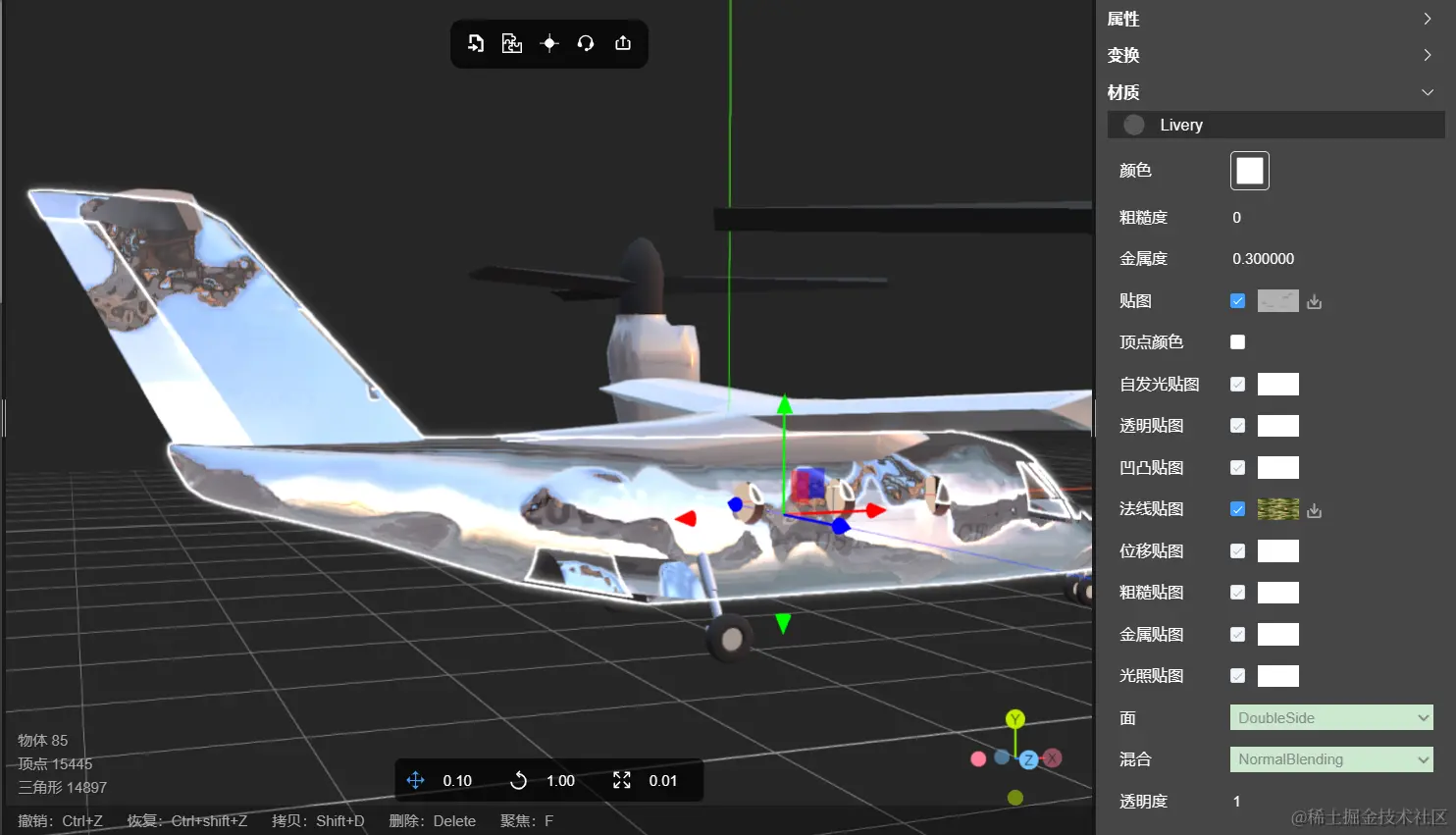 我们用GLTF 编辑器 为飞机翅膀的设置凹凸贴图,操作步骤:1、在场景中选中飞机的机身,右侧会弹出材质设置面板;2、在面板中找到凹凸贴图设置组件,直接上传材质贴图即可(材质贴图提前制作好,保存到本地),效果如下图: