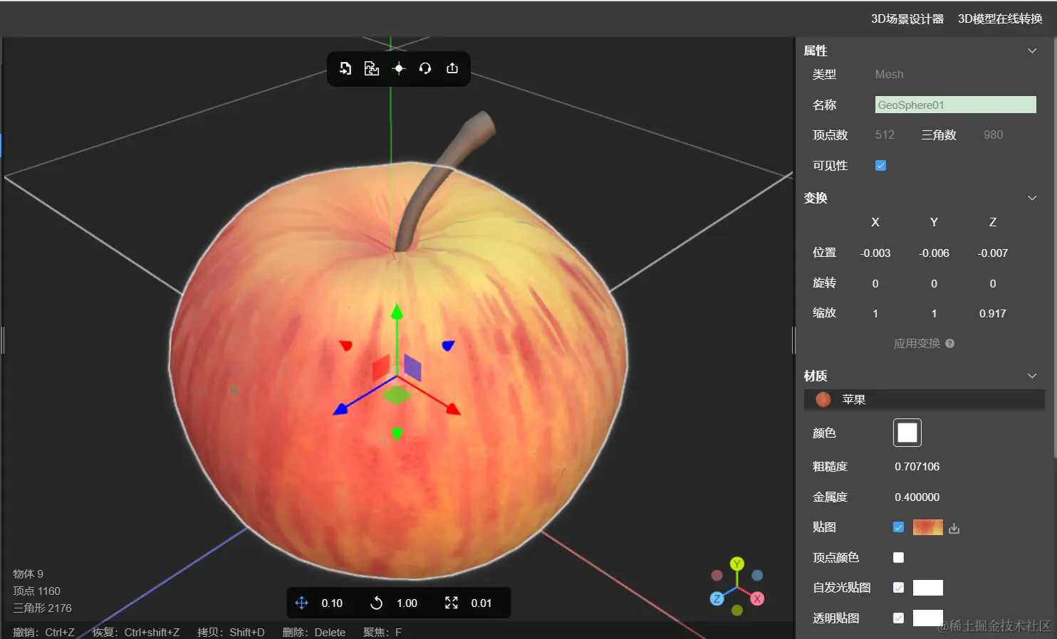 可以看到, 苹果表面的几何形状变化和细节变化都和贴图上的凹凸、纹理或细节比较相似。看完之后,是不是对位移贴图有了一个比较全面的认识。下一期, 将为您介绍法线贴图的实现原理。