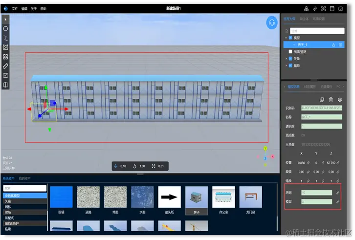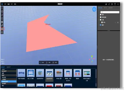 区域摆放: 选择模型,鼠标左键绘制区域,右键结束完成线性摆放。还可已通过属性面板对区域模型数量等属性调整或者编辑绘制区域。