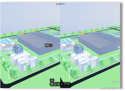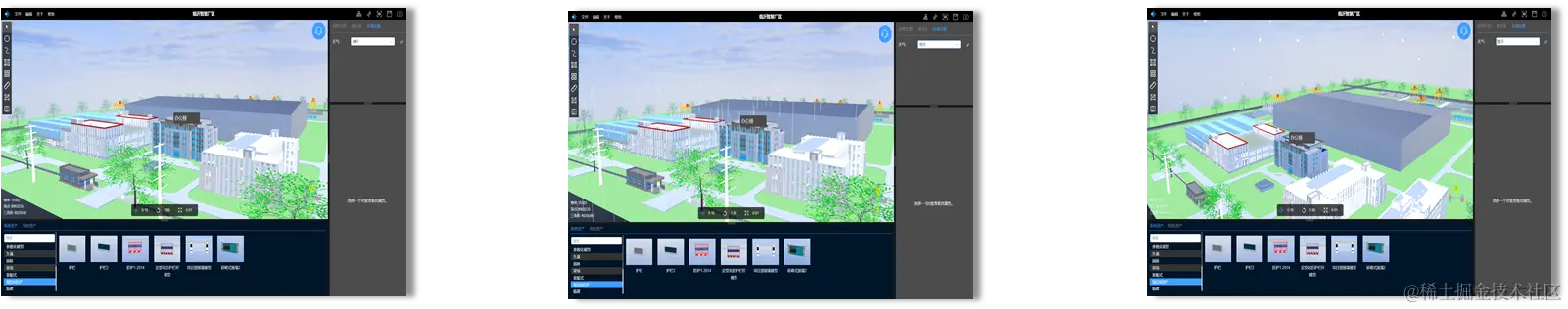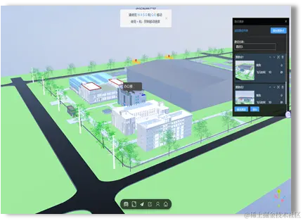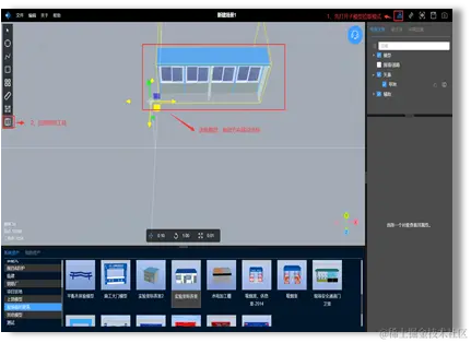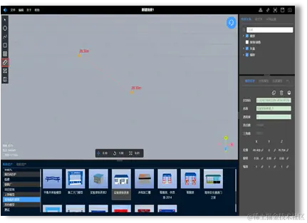 通过工具栏工具方便快捷的完成场景搭建,工具栏模型摆放工具包括点摆放、线性摆放、区域摆放、阵列式摆放;包括其他辅助工具:空间测距、面积测量、模型剖切、移动、缩放、旋转。