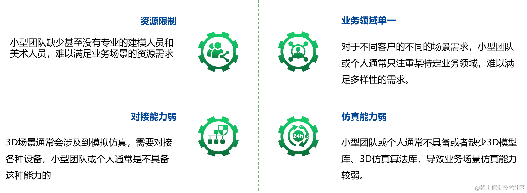 数字孪生的建设流程涉及建模、美术、程序、仿真等多种人才的协同作业,人力要求高,实施成本高,建设周期长。如何让小型团队甚至一个人就可以完成数字孪生的开发,是数字孪生工具链要解决的重要问题。考虑到数字孪生复杂的生产流程,一个面向小型团队的数字孪生开发工具应该考虑以下问题: