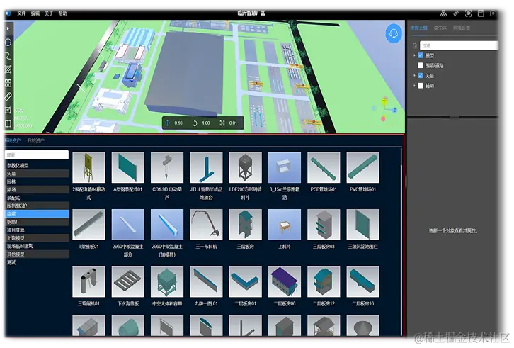 系统资产: 系统内置的资产库,所有用户都能浏览和使用。目前的内置资产库有临建、钢筋场、梁场、项目驻地、园林、矢量、参数化工模型、装配式、围挡&f防护等多个分类总共有1000+3D模型.