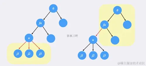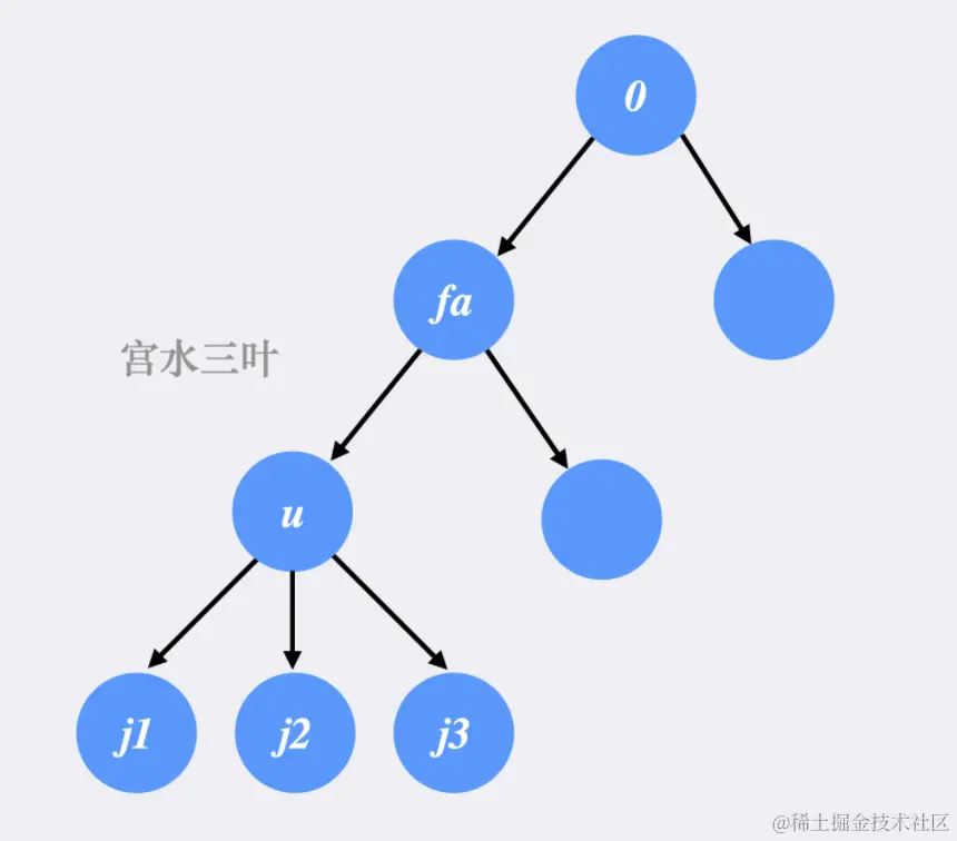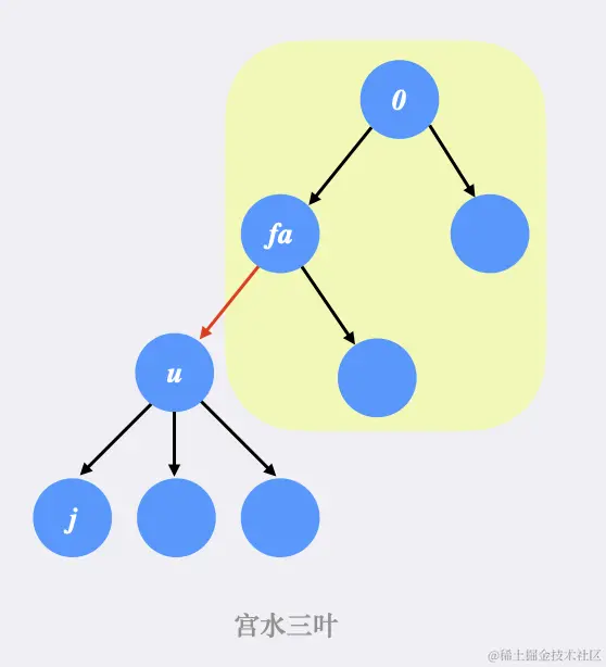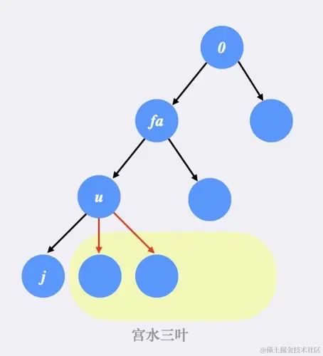 不妨以编号为 0 的节点作为根节点进行分析:假设当前处理到的节点为 u,当前节点 u 的父节点为 fa,同时 u 有若干子节点 j。