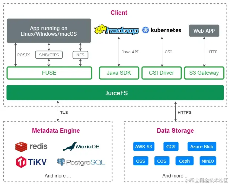 JuiceFS 采用了数据和元数据分离存储的架构,同时具备完全可插拔的设计,我个人认为这个构想非常出色。在进行基于 JuiceFS 的二次开发时,我们能够轻松地适应内部企业需求,充分利用已有的成熟组件,以满足不同应用场景下的数据管理需求。