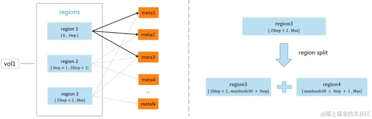 数据被划分为不同的 region。每个文件系统都有多个数据分片,按照 inode 区间进行划分。随着数据量的增长,分片的数量也会增加。每个分片都会被均匀地分布在不同的元数据节点上。在一定条件下,会进行分裂操作,以便更好地实现水平扩展。目前,我们的生产环境中最大的一个集群已经拥有了 30 多亿个文件,预计可以扩展到百亿级别。