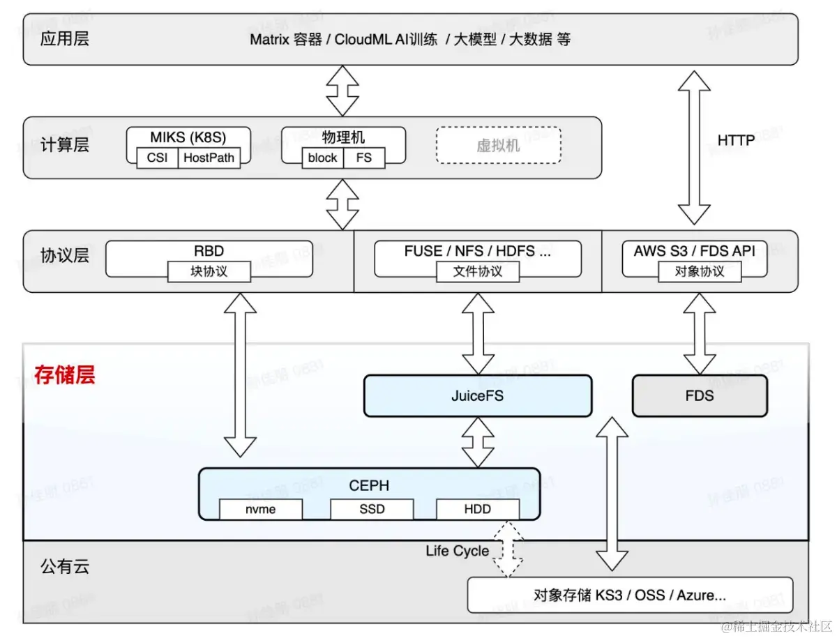 在上述架构图中,作为存储平台,我们不仅提供了 JuiceFS 文件存储服务,还提供了基于 Ceph RBD 的块存储服务。同时,Ceph 为 JuiceFS 提供了底层对象存储支持。我们还拥有内部的 FDS 对象存储服务,可以适应 IDC 以及各种公有云对象存储,为业务提供无缝的跨多云的服务。我们向上层提供了不同的协议支持,包括块协议、文件协议和对象协议。在更高层次,我们为 PaaS 平台和计算层提供支持,最顶层则是应用层。