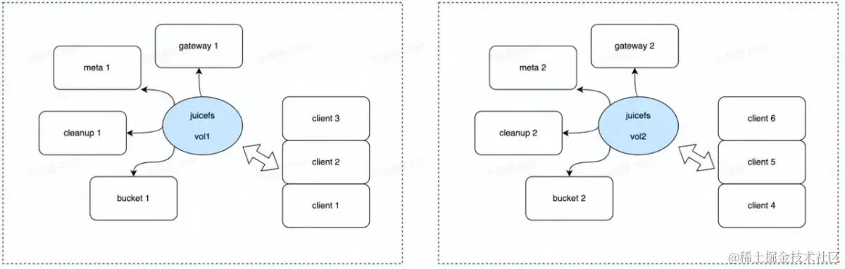 在 JuiceFS 社区版中,文件系统之间缺乏统一的管理,用户需要自行设置他们自己的 meta 服务、bucket 等。例如,当业务部门创建一个新的卷时,他们需要自己申请 Redis、bucket、网关等,并设置后台任务,这使得整个过程繁琐且依赖于客户端。如果业务部门需要创建另一个卷,他们必须重复之前的工作,因为所有工作都是在客户端完成的。