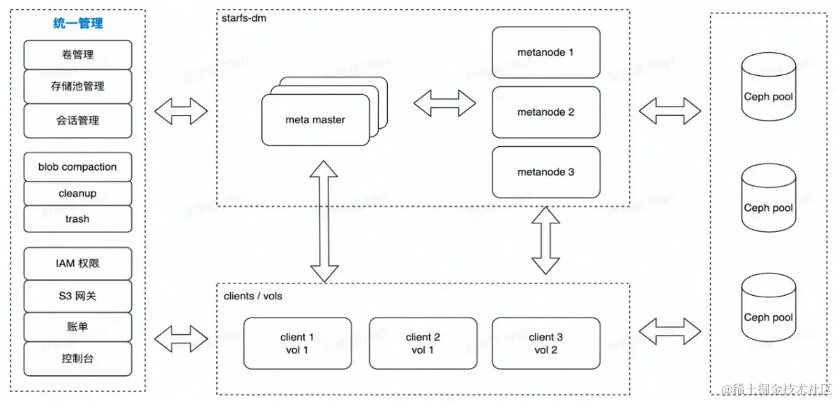 首先,我们可以看到在这个层次上,最顶层是 meta 服务,分为 master 和 metanode。我们通过 meta master 进行了统一管理,将跨客户端的工作功能集成到了统一的管理层次。这包括基本的管理功能,如卷的创建和删除,以及存储池与 bucket 的管理,还包括一些会话管理机制。一些异步任务由中心统一维护,包括 compaction、数据清理等流程。