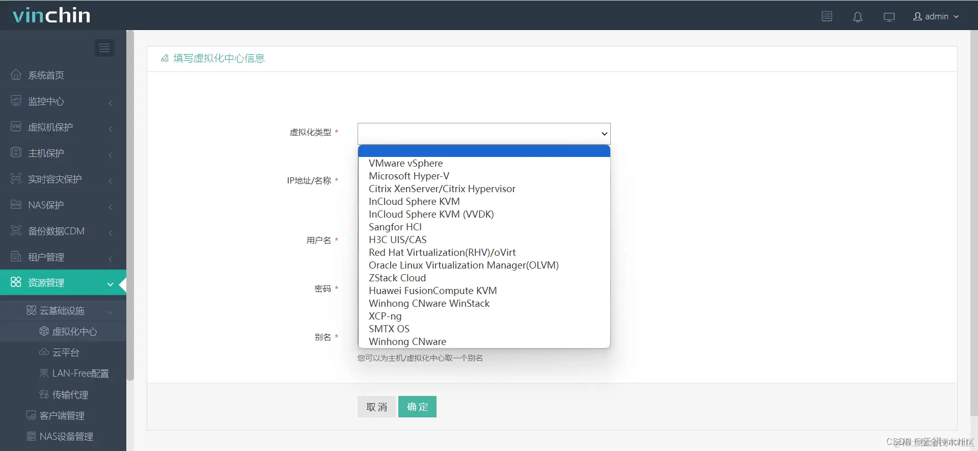 云祺容灾备份系统也同样支持虚拟机无代理备份,并且支持的虚拟化平台种类非常多,只需选择虚拟化类型,输入该平台的IP地址,用户名和密码即可与虚拟化平台建立通信,建立完成后,会自动扫描出平台上所有的虚拟机,无需在虚拟机内安装任何插件,即可对虚拟机进行备份。