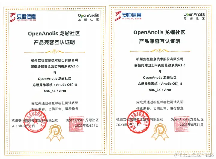 (图/安恒信息与龙蜥操作系统适配证书)