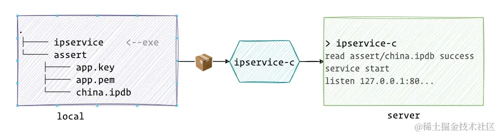 示例是一个 c 语言编写的 ip 解析服务 gcc -o ipservice,其依赖 ipdb 资源文件。
