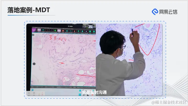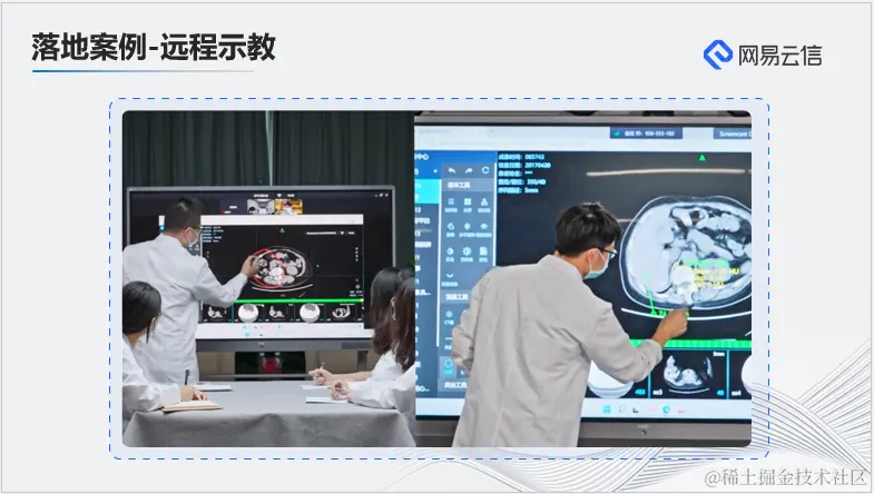 接下来展示云信RTC方案在客户侧的落地效果。我们与浙江一家三甲医院达成了合作,上图为院方进行MDT会诊的实景照片。可以看到,院方借助超高清RTC系统可以实现细致的远程病理切片分析。