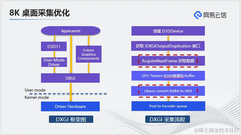 接下来介绍我们针对8K桌面采集的优化。DXGI是微软推出的基于硬件驱动层的图形操作接口,可以支持不同图形库间的互操作。右侧为大致的采集流程,在创建D3DDevice后,利用IDXGIOutputDuplication接口的AcquireNextFrame函数获取屏幕画面,将Texture转为RGBA数据,再使用Libyuv 把 RGBA 转为 I420,并将其发送至编码器。