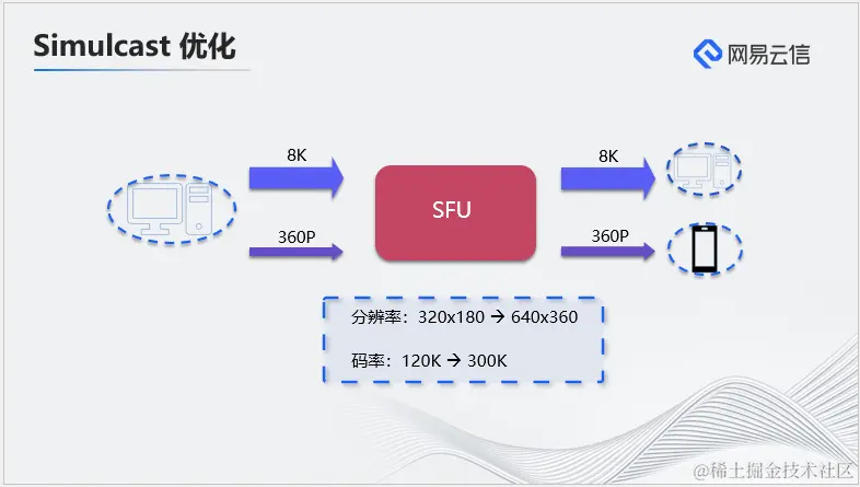 接下来介绍关于Simulcast(大小流)的优化。考虑到网络状况和接收端的性能限制,服务端会同时发送一个大流和小流,接收端可以依据自身性能选择接收合适的视频流,服务端也可依据网络条件选择发送合适的流。我们针对小流的质量进行了优化,将小流分辨率从180p提升到360p,码率从120k提升到300k。