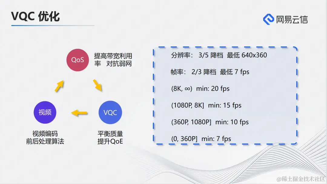 接下来介绍针对VQC模块的优化策略。VQC是视频引擎的质量控制模块,用于平衡RTC系统视频的清晰度、流畅度和延时三个质量指标,提升视频QoE。三个指标由上图中视频编码、QoS和VQS的互相作用决定。