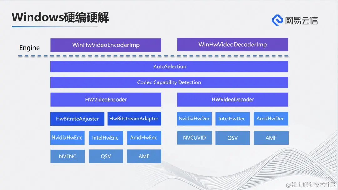 接下来介绍关于Windows端硬编硬解的优化,我们的SDK支持Nvidia、Intel和AMD三大厂商的硬件平台,最下层为基于不同平台抽象的硬编解码器,在此之上为BitrateAdjuster和BitstreamAdapter,用于动态平滑码率发送和过滤码率中额外的NALU。在引擎层会抽象不同的硬编解码器供SDK使用。