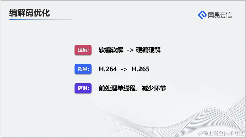 接下来介绍视频编解码方面的优化,首先对于落地的硬件平台而言,8K软编软解是不可能的,需要考虑硬编硬解。其次在质量方面,H.264已经不能胜任4K/8K视频的编码,因此编码器改为使用H.265。最后是延时,由于8K编码对系统性能和延时的压力很大,因此要尽可能优化前处理流程,去掉不必要的环节,从而降低延时。