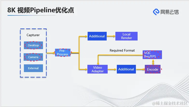 8K RTC 对视频引擎Pipeline的优化点主要集中在屏幕共享、摄像头采集、前处理、编码和VQC五大方面。