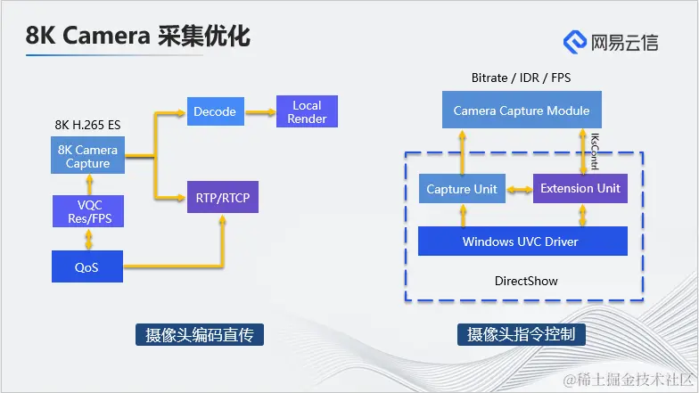 因此我们使用Dshow在采集模块中加入了摄像头指令控制模块,基于Windows UVC Driver增加了可查询Control接口的Extension Unit,使采集模块能通过Extension Unit动态调整编码参数。同时我们还增加了IDR请求能力,使中途加入会议的用户能够快速接收I帧,显示画面。