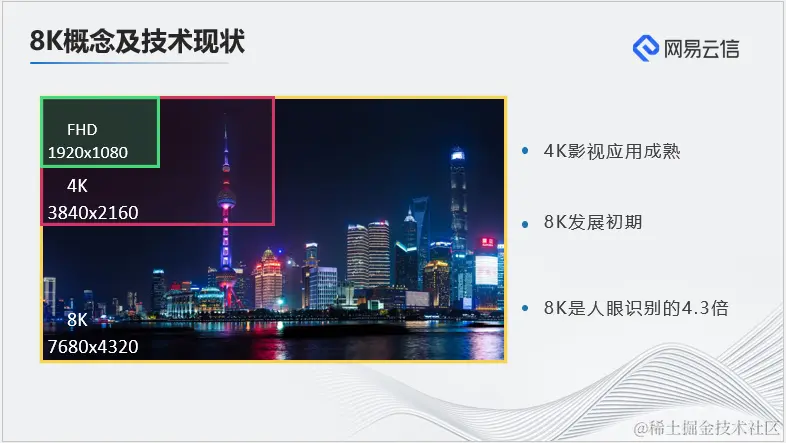 我们再来了解8K的概念,与当前RTC常用的FHD 1080P和影院、音视频点播成熟化应用的4K分辨率相比,8K超高清分辨率达到了4K的4倍,1080P的16倍。它包括更丰富、更细腻的画面细节,传达的信息量是人眼可识别范围的4.3倍,即使对画面的个别位置进行放大也几乎不会出现细节损失,这更有利于远程医疗病理分析和远程传输等方面的应用。