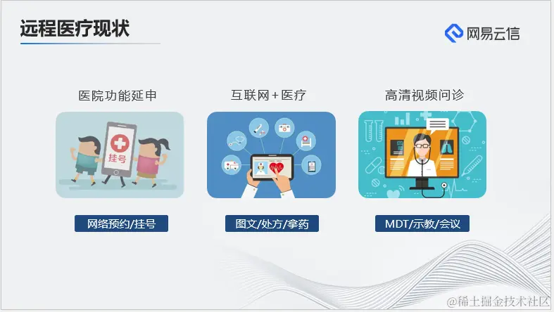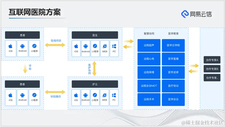 接下来介绍我们现阶段在远程医疗方面应用的一些方案。上图为网易云信互联网医院的架构图,左侧为传统互联网医院就医的闭环流程。中间为本次主要介绍的基于云信RTC SDK打造的智慧协同医疗教学功能模块,它包含远程病理、远程SDT会诊、远程培训和会议等能力。