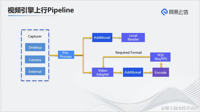 接下来具体介绍视频引擎的上行Pipeline,其中左侧的视频采集模块支持桌面采集、摄像头采集和第三方输入等方式,输入的视频经过前处理将分为两路,一路经过叠加水印、打码等额外处理后进行本地渲染以供预览。另一路将经过额外处理传输至编码器。VQC模块会根据网络条件动态调整视频分辨率、码率、帧率等编码参数,提高观看体验。