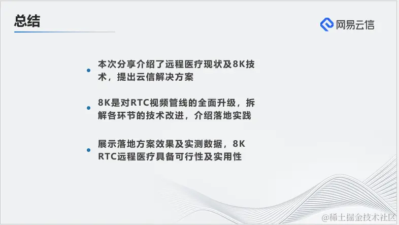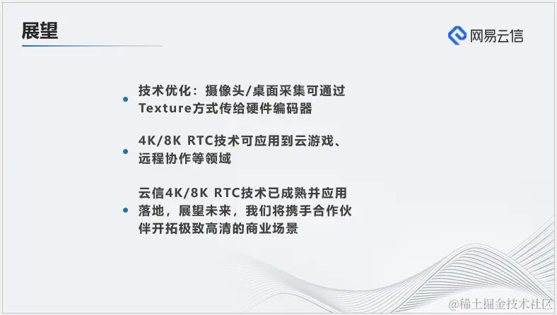接下来进行总结和展望。本次分享主要介绍了网易云信针对远程医疗提出的解决方案。8K RTC不仅是对分辨率的提升,也是对RTC视频管线的全面升级。我们在各方面进行了一些技术改进,介绍了落地过程中的技术挑战、解决方案以及最终实际的落地效果。