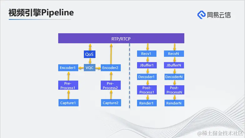 云信RTC SDK的视频引擎Pipeline如上所示。顶部为网络传输模块,左侧为视频上行流程,历经视频源采集、前处理至编码、上传,支持主辅流双路通道。VQC模块会通过QoS评估网络带宽动态调整编码器参数。
