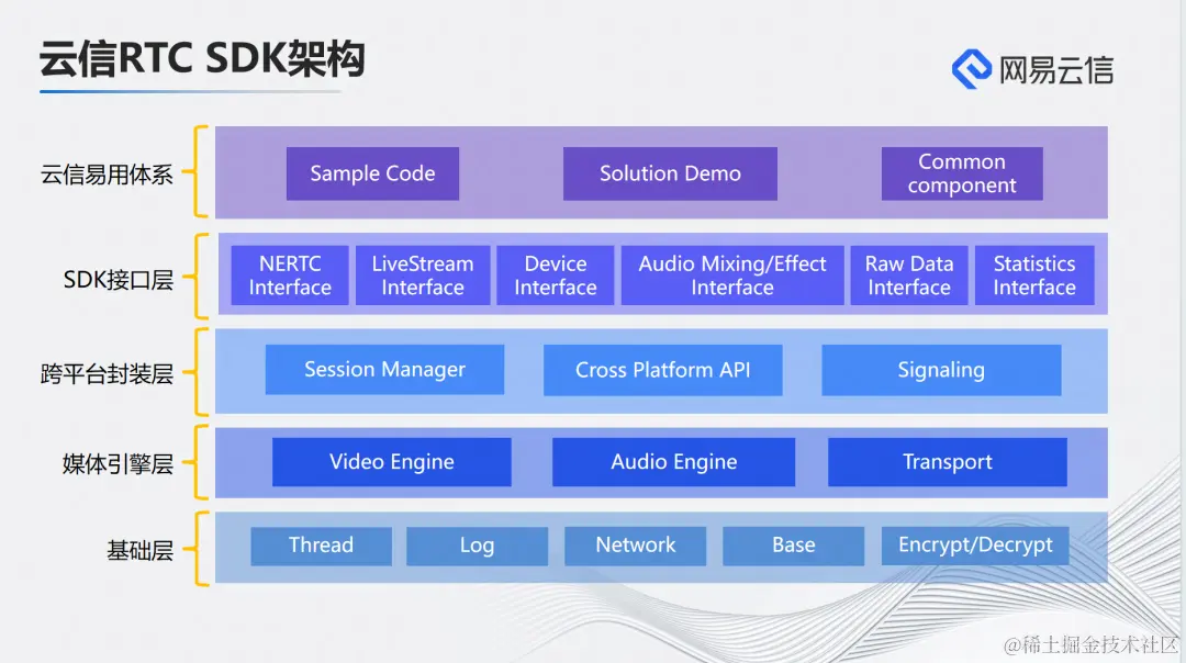 云信RTC的SDK架构如上所示,它的分层较为清晰。首先最底层为基础层,在此之上为核心的媒体引擎层,包括视频引擎、音频引擎和传输引擎模块。接着是跨平台封装层,该层会抽象一些跨平台API,包括信令传输等模块,我们在该层还会构建一些通用的音视频逻辑,如视频主辅流双通道分流、主流Simulcast机制等。再上一层为SDK接口层,针对各个平台不同的Native language进行API封装,并提供给客户进行集成。顶层为我们推出的云信易用体系,可以提供 Sample Code、行业解决方案Demo和通用组件,便于客户进行集成。