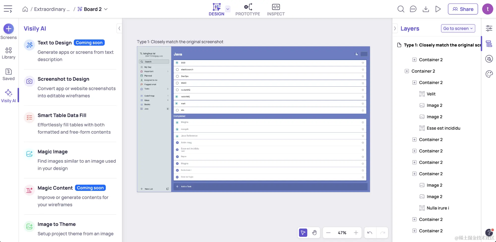 当然visily本身还有很多功能可以使用,其中最期待是根据提示词来生成UI设计稿,这样就可以彻底解放程序员的开发能力,做出自己想要且美观的产品。不得不说随着AI技术的发展,未来更大的可能行一个人可以完成一个团队的任务,这也利好了个人开发者或者创业者。但是,我始终觉得目前还不用担心AI会抢走我们的饭碗,因为就生成的UI来说,虽然看起来像那么回事儿,但是离真正的商业设计稿还是有所差距,需要专业的UI设计师来进行调整。