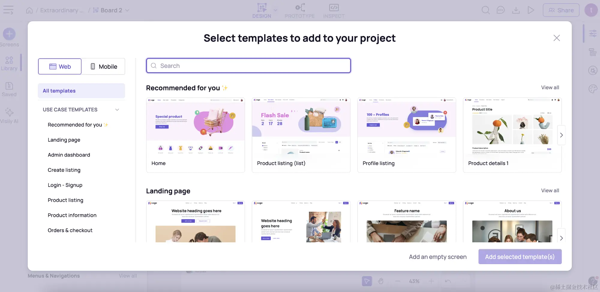 Visily有模版生成的功能也是作为个人开发者非常喜欢的,这个软件自带了一些常规和常用的UI设计稿模板,包括Web网页和App的。