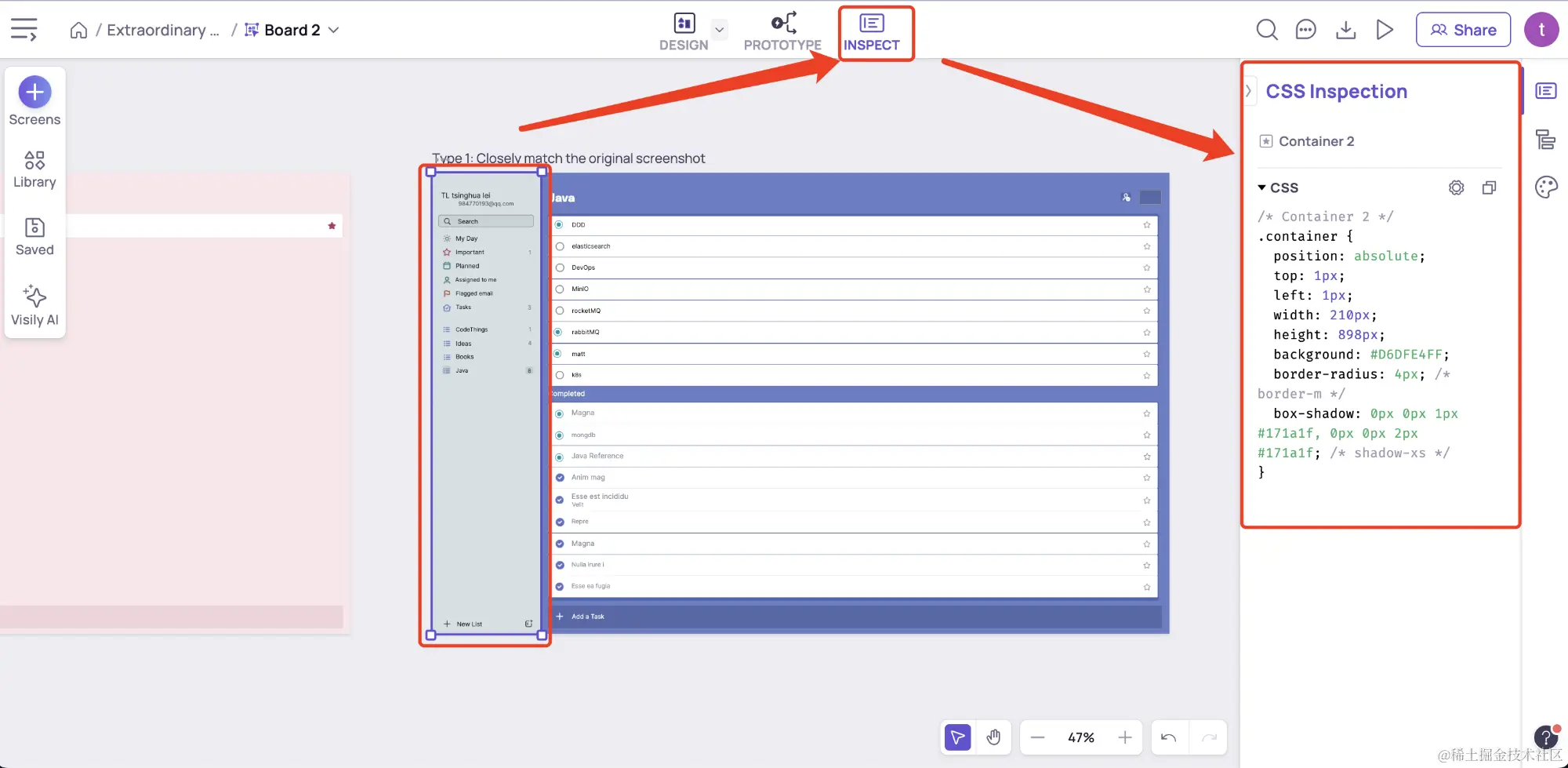 - 3. 例如这里我们截取了一个todo的UI,生成的设计稿如下,选择inspect可以直接获取你选择地方的css代码,非常方便。