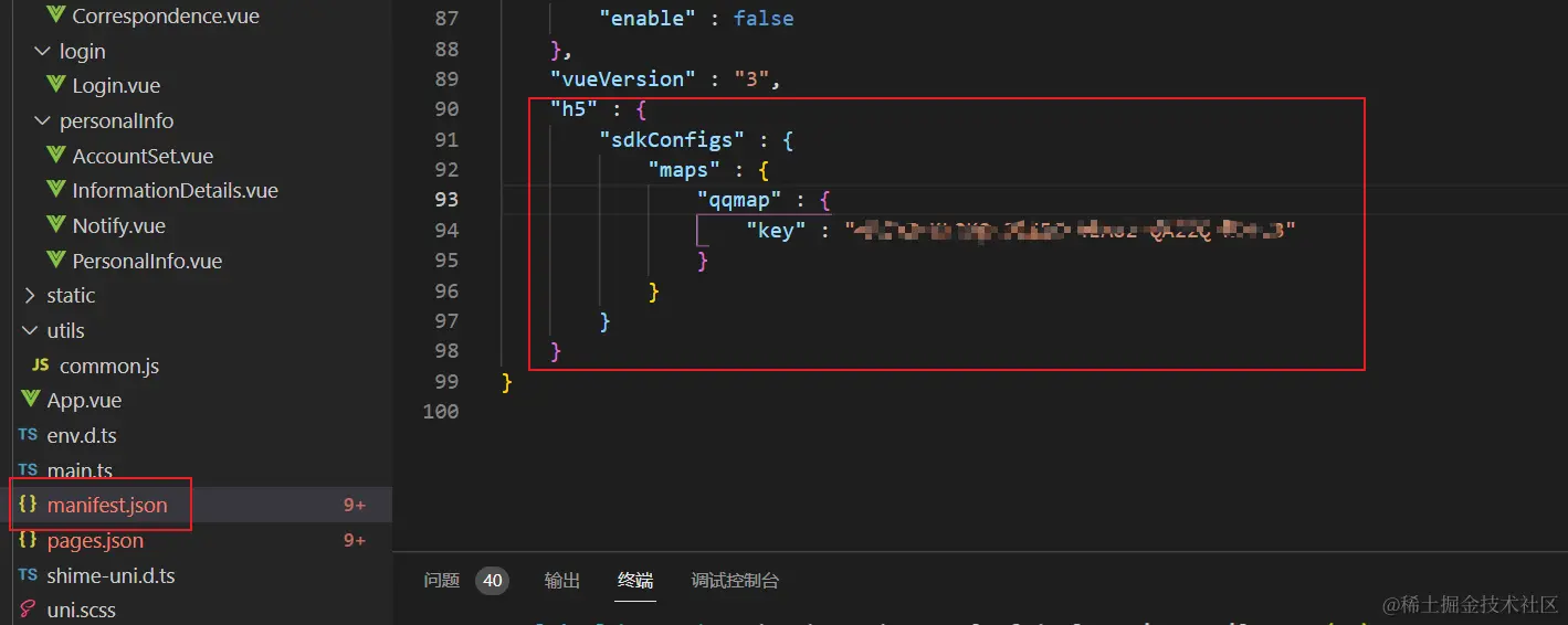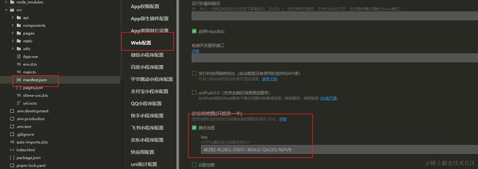 第四步:在 manifest.json 文件 Web配置中,定位和地图勾选腾讯地图,将自己的腾讯地图的 Key 粘贴至此。