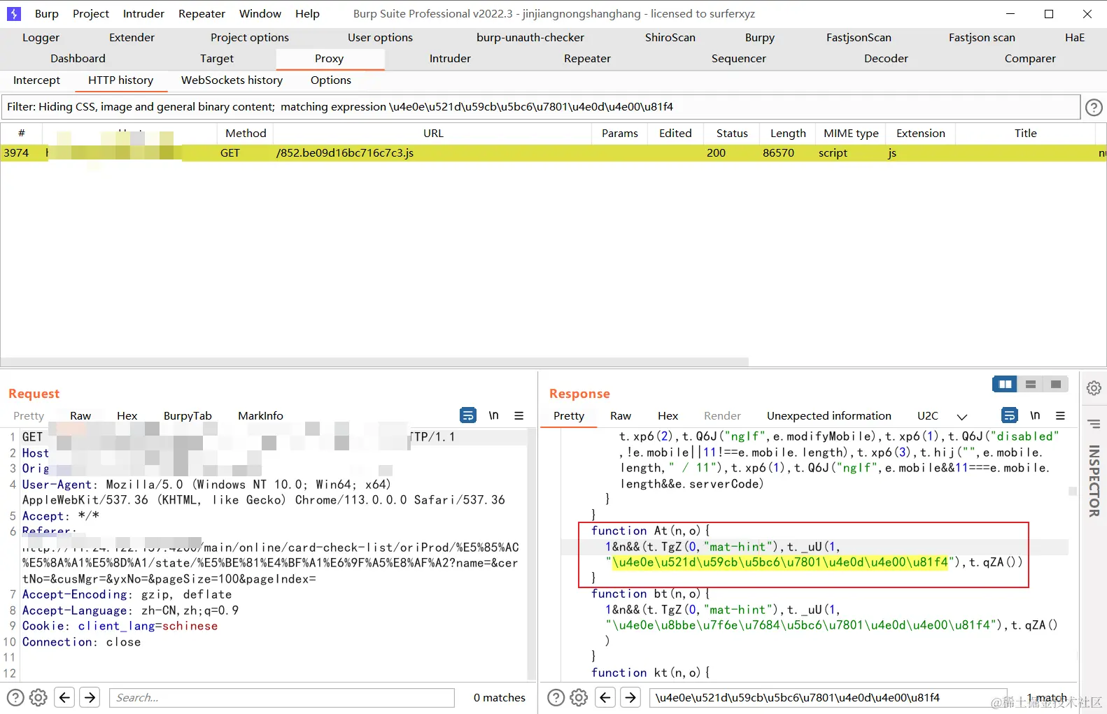 对于搜索,可以把js和html页面都代理从burp出去,然后使用burp自带的搜索,可能会比较方便。我这边就是采用这种方法进行查询: