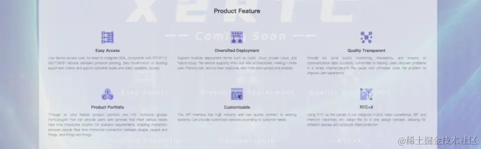 f.RTC+X,以RTC为载体,融合H.323、视频监控、SIP、对讲机等,采用Al-in-one设计理念,让不同设备、不同协议互通互联。