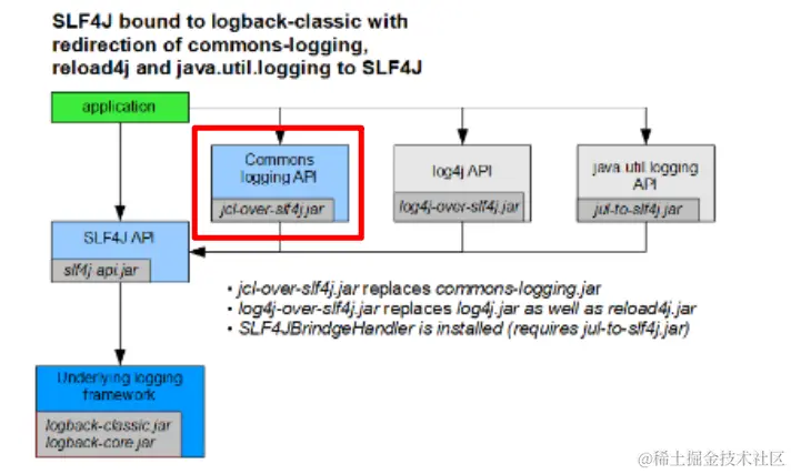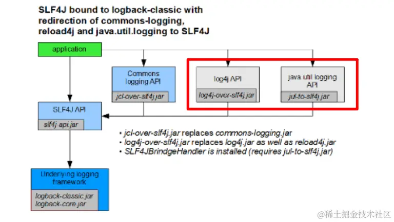 jcl-over-slf4j库,把调用 Log4j 打印日志的地方适配成 SLF4J 的API - JUL:同样是这个库,实现自定义的处理器,把 JUL 打印日志的地方进行适配的处理