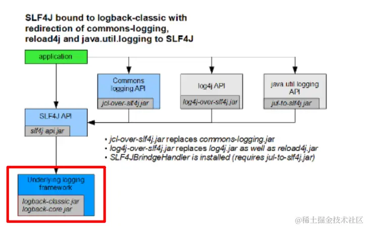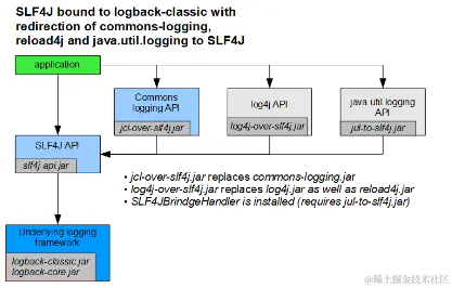 我们如果使用 LogBack 作为日志的实现框架,也就是图中的蓝色部分: