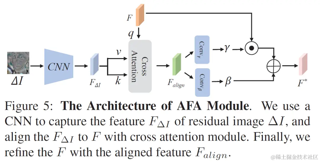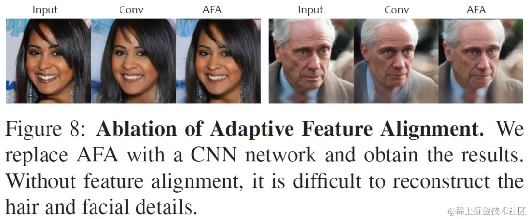 但是 latent (W space,W+ space) 的表达能力在之前 2D GAN Inversion 研究中已经被验证是比较有限的,无法做到高质量的重建,一些细节纹理需要补充,因此设计了自适应特征对齐的 AFA 模块。我们在第一步 encoder 的重建中获得的 latent 生成的 feature 是标准的,然而第一步重建结果和输入图片的残差 feature 是和输入图片的视角绑定在一起的,他们在 spacial 上不能直接对齐,因此这里设计了一个 attention 的调制,把 生成网络中间的 canonical feature 作为 query,残差的 feature 作为 key 和 value 从而将两者自适应地对齐,达到了补充细节纹理的效果。AFA 模块结构如下。