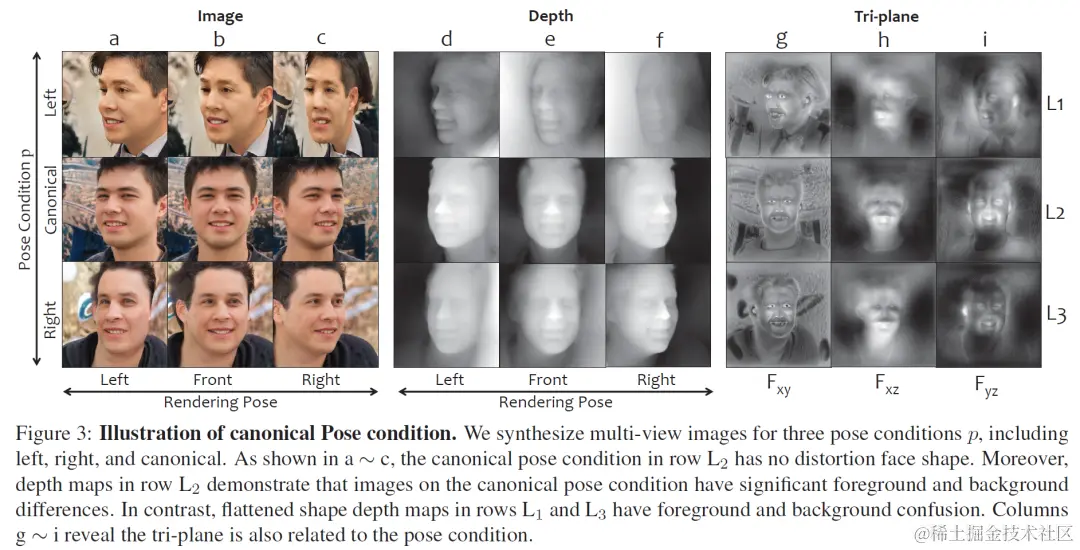 我们以 EG3D 为例进行分析,实验显示不同 condition 下采样的 latent 会产生不同质量的3D几何,在完整的 latent space 中,不是每一个采样的 w 都能产生完整的几何,只有在 canonical latent space 中采样得到的 latent 可以生成高质量的完整几何(Fig. 3 中间一行),其生成的相应 3D 表示 tri-plane上的特征也体现出 canonical 性质,因此定义为 canonical feature space。(以人脸为例,tri-plane 体现的是一个正脸的视角)