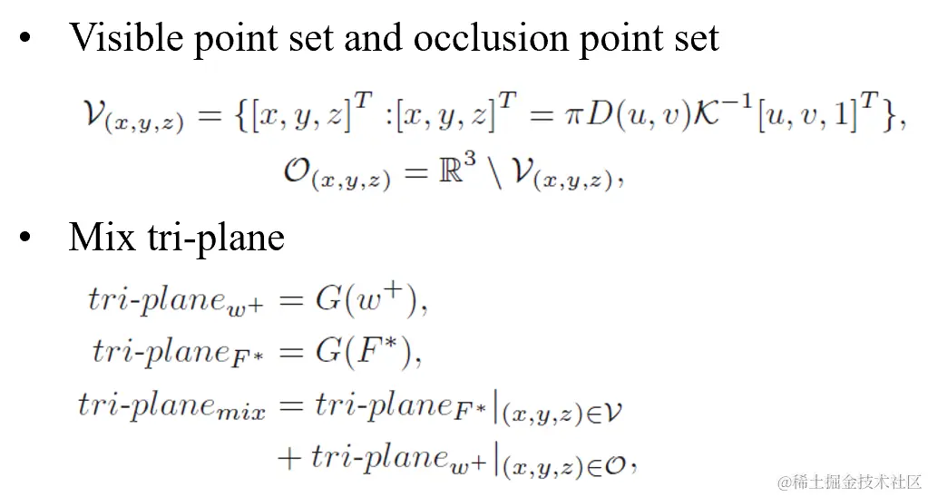 而给定的图片是2D的,存在遮挡的问题,应该只在输入图片能看见的位置补充的细节,因此我们根据相机的内外参和输入视角的深度,定义了可见点集和遮挡点集,在对tri-plane渲染进行特征选取的时候,对于可见点集,我们使用补充细节后的tri-plane的特征;对于遮挡点集,我们使用第一步 encoder 获得的能生成完整几何的 triplane 的特征。通过这种方法,将两个 tri-plane 结合在一起获得最后的 3D 表示。